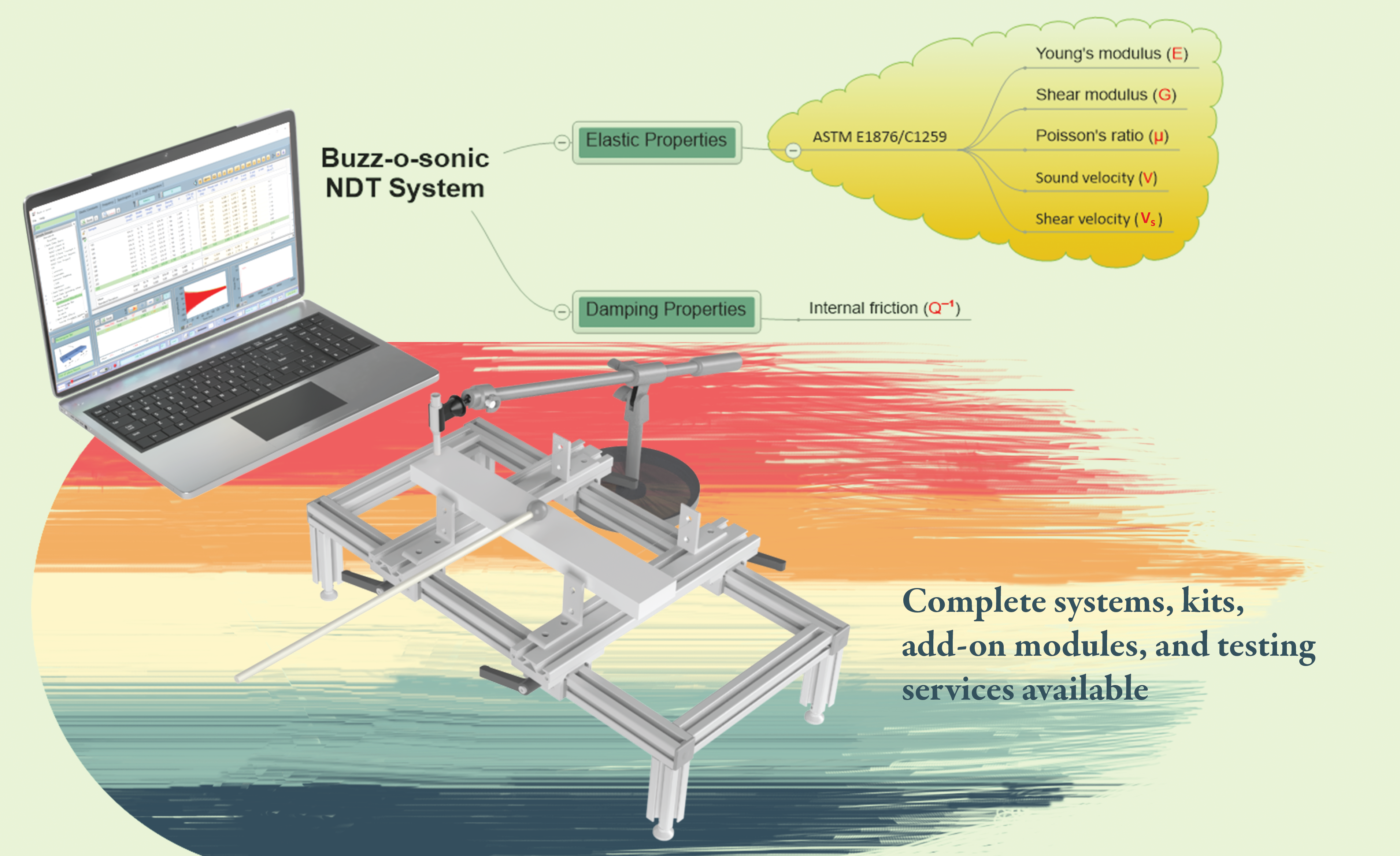 Buzz-o-sonic is a professional system for measuring the dynamic elastic and damping properties of materials, using the impulse excitation technique (ping test). It is the most cost effective and flexible instrument available. According to independent research at Oak Ridge National Laboratories, it is also one of the most precise. Custom designed systems/kits for QA/QC, high temperature measurements, vacuum, and other applications are available.